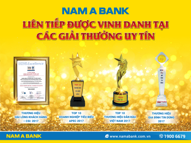 Trước thềm chào mừng kỷ niệm ngày thành lập (21/10/1992 – 21/10/2017), vừa qua, Nam A Bank tiếp tục khẳng định thương hiệu khi được vinh danh tại các giải thưởng uy tín: Top 10 “Doanh nghiệp tiêu biểu APEC 2017”, Top 10 “Thương hiệu dẫn đầu Việt Nam 2017”, “Thương hiệu hài lòng khách hàng – CSI: 2017” và “Thương hiệu gia đình tin dùng 2017”.
