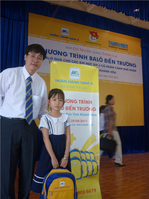 Tưng bừng chào mừng khai giảng năm học mới 2011-2012, sáng ngày 29 và 30/08/2011, Ngân hàng Nam Á (NAM A BANK) phối hợp với Báo Thanh Niên trao tặng 500 Balô “Nhớ cội nguồn –Hướng tương lai” trị giá 60 triệu đồng cho các em học sinh cấp 1, cấp 2 có hoàn cảnh khó khăn tại địa bàn Huyện Cam Lâm, tỉnh Khánh Hòa và xã bán đảo Nhơn Hội – TP. Quy Nhơn, Bình Định.