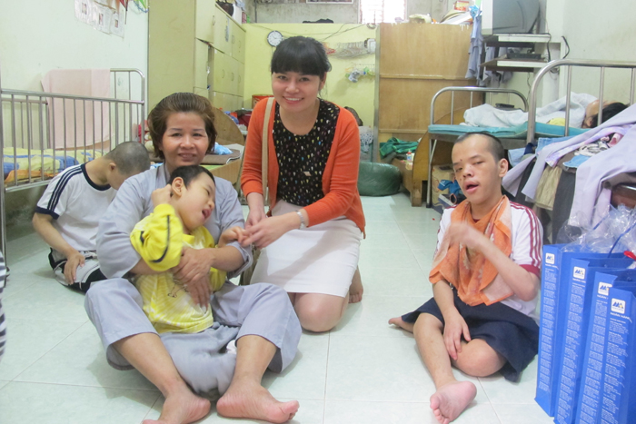 Bé Kim Chi – 15 tuổi, bị dị tật bẩm sinh. Bé rất thích đi học và đọc chữ, tuy học xong rồi lại quên hết vì thần kinh yếu nhưng với sự cố gắng và ham học hỏi của bé, hy vọng sau này bé sẽ có cơ hội được phát triển bình thường như bao trẻ em khác, trở thành người có ích cho xã hội.