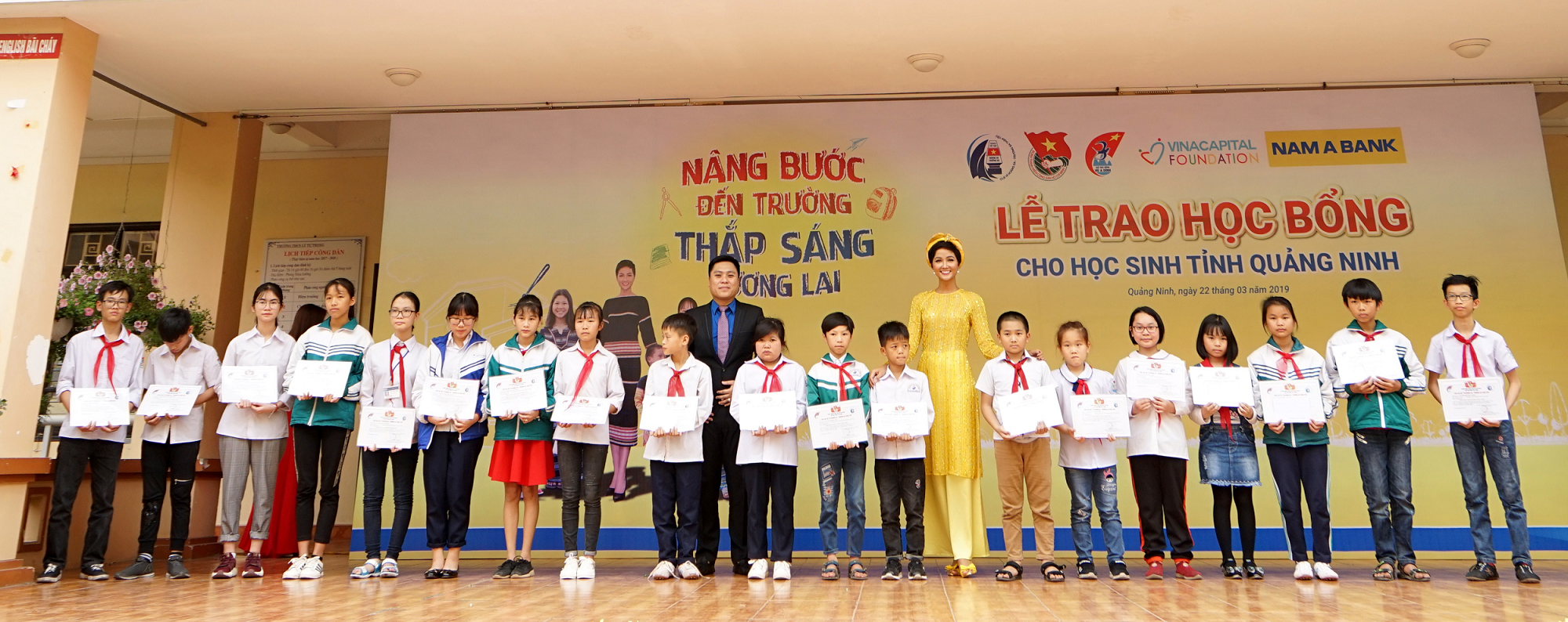Sau các tỉnh Đồng Nai, Đà Nẵng, Cao Bằng và Đắk Lắk, với mong muốn tiếp thêm động lực, chắp cánh ước mơ cho nhiều em học sinh, sinh viên hơn nữa, năm 2019, hành trình trao học bổng “Nâng bước đến trường – Thắp sáng tương lai” của Nam A Bank tiếp tục lăn bánh đến khắp mọi miền đất nước. Vừa qua, tại trường THCS Lý Tự Trọng tỉnh Quảng Ninh, Nam A Bank đã cùng Nguyên Phó Chủ tịch nước Trương Mỹ Hoa – Chủ tịch Qũy học bổng Vừ A Dính – Chủ nhiệm Câu lạc bộ “vì Hoàng Sa –Trường Sa thân yêu” và Đại sứ nhân ái Hoa hậu H’Hen Niê trao 150 phần học bổng cho các em học sinh dân tộc thiểu số và học sinh vùng biển đảo.