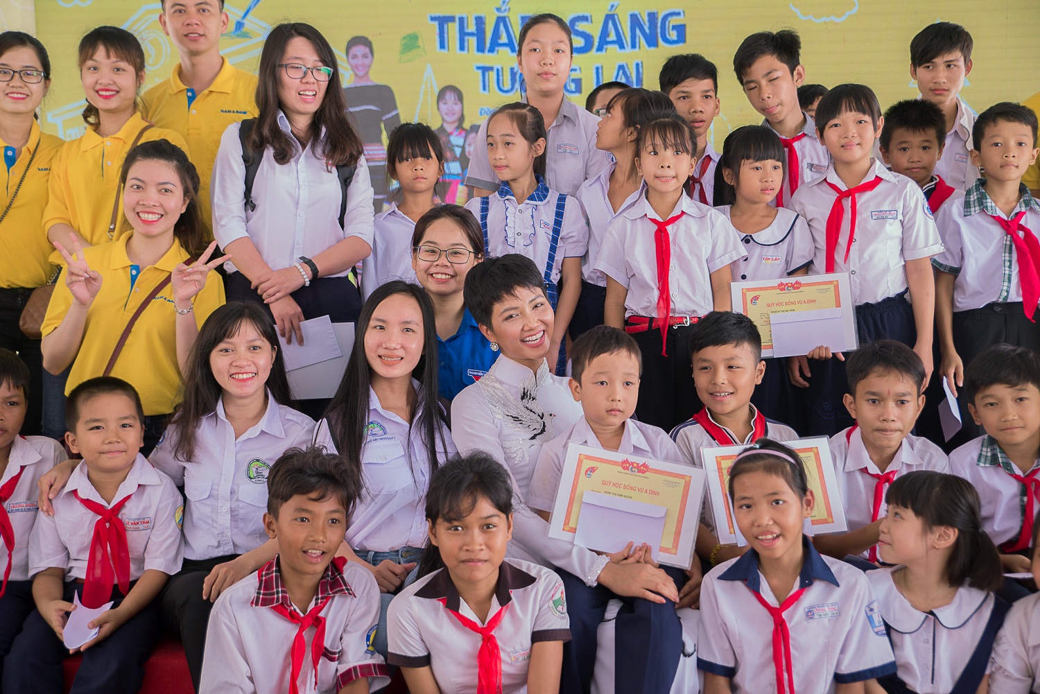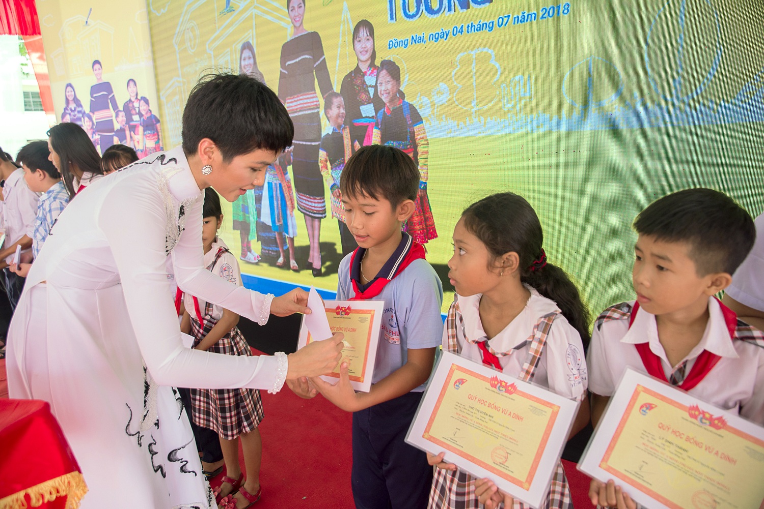 Bà Trương Mỹ Hoa trao những phần học bổng cho các em học sinh tiểu học.