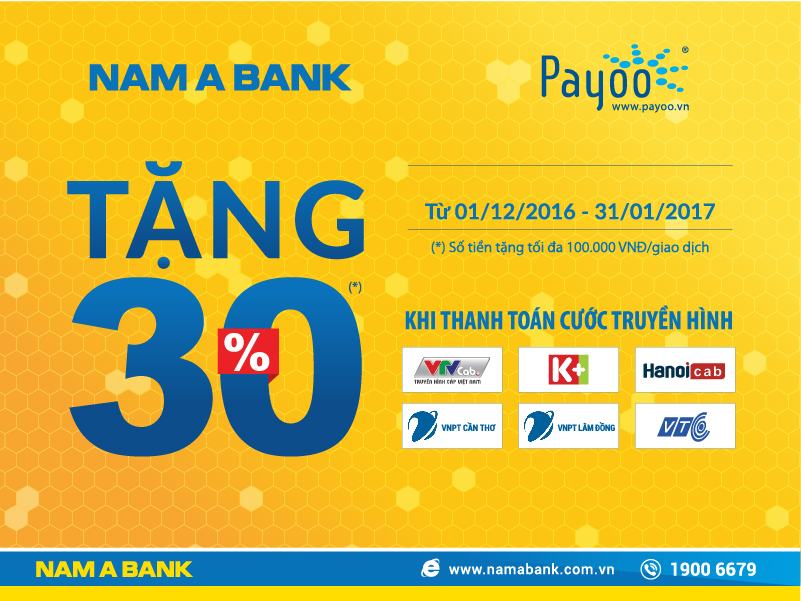 Từ ngày 01/12/2016 đến ngày 31/01/2017, Nam A Bank phối hợp với Payoo triển khai chương trình “Ưu đãi thanh toán hóa đơn truyền hình” tặng 30% giá trị giao dịch cho khách hàng thanh toán qua Payoo.