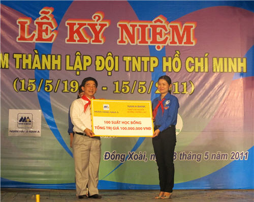 100 suất học bổng với tổng trị giá 100 triệu đồng đã được Ông Huỳnh Thành Chung – Phó chủ tịch hội đồng quản trị NAM A BANK trao tại Lễ kỷ niệm 70 năm ngày thành lập Đội TNTP Hồ Chí Minh (15/05/1941 – 15/05/2011) do Ban thường vụ tỉnh đoàn Bình Phước tổ chức vào ngày 08/05/2011 tại sân vận động Tỉnh.
