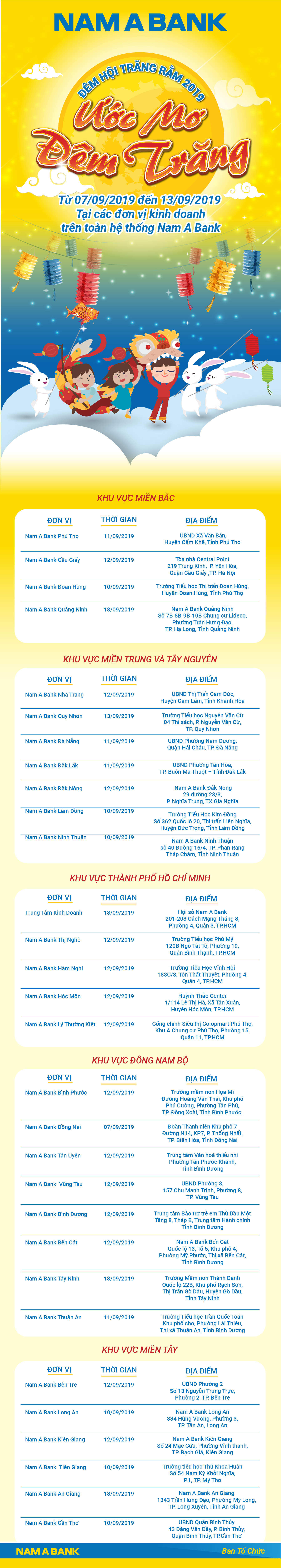 Tết Trung thu luôn là lễ hội đặc biệt dành riêng cho tất cả các em thiếu nhi ở mọi miền tổ quốc, là dịp để mọi gia đình quây quần bên nhau tận hưởng một cái Tết đoàn viên trọn vẹn yêu thương. Thấu hiểu ý nghĩa sâu sắc đó cùng mong muốn mang đến cho các em thiếu nhi một mùa trung thu tràn đầy tình yêu thương, Nam A Bank tiếp tục tổ chức Đêm hội trăng rằm 2019 với chủ đề “Ước mơ đêm trăng” trải dài các địa phương trên cả nước. Đây cũng là một trong những hoạt động được triển khai nhằm tri ân, lan tỏa hạnh phúc đến khách hàng và gia đình đã, đang đồng hành cùng Nam A Bank trong thời gian qua.