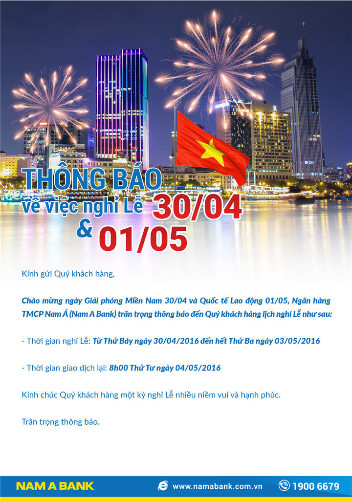 Nam A Bank thông báo nghỉ Lễ 30/04 - 01/05