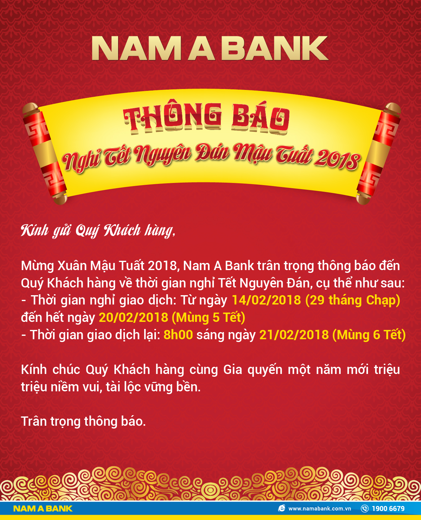 Nam A Bank thông báo nghỉ Tết Nguyên Đán Mậu Tuất 2018