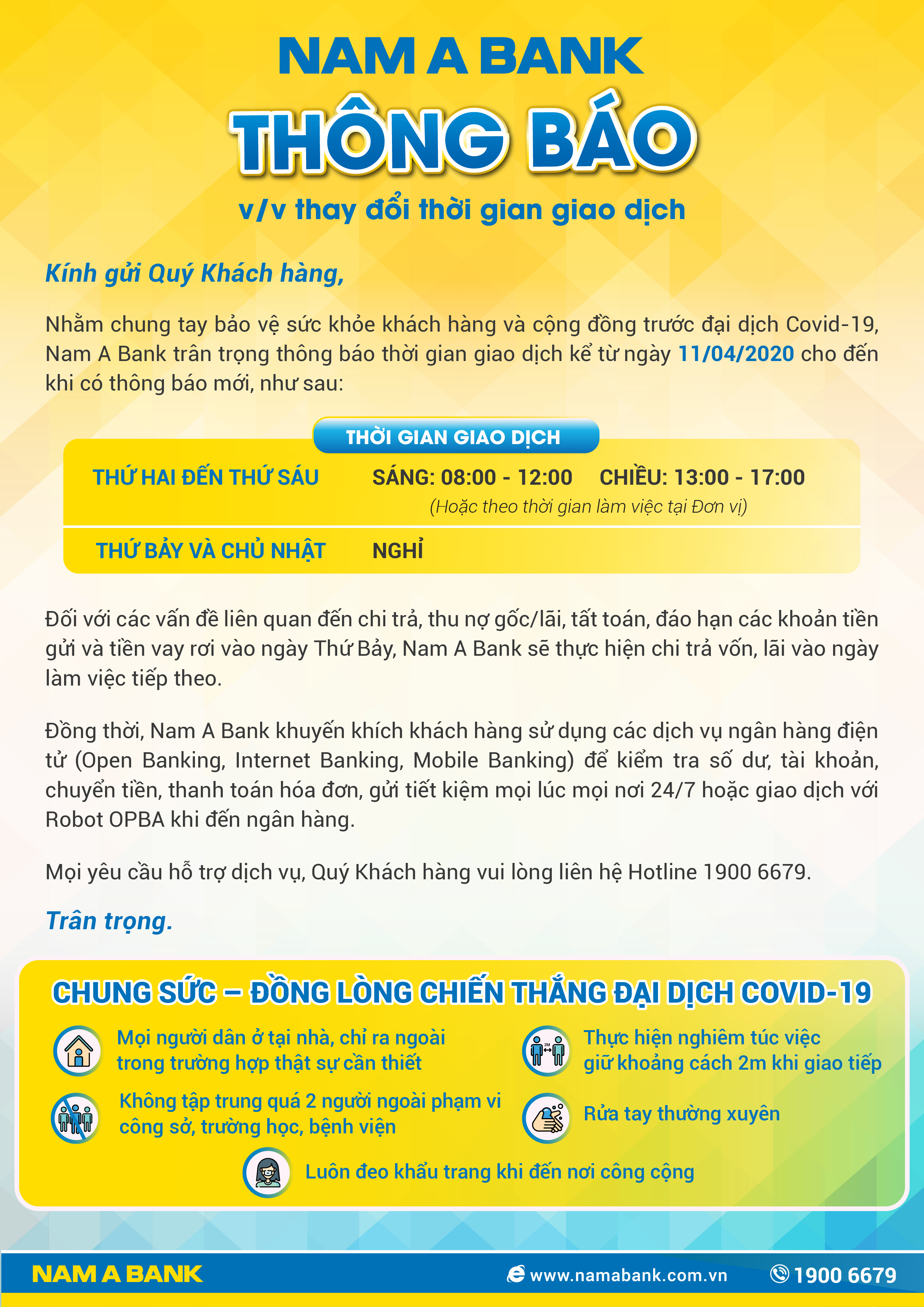 NAM A BANK THÔNG BÁO THAY ĐỔI THỜI GIAN GIAO DỊCH