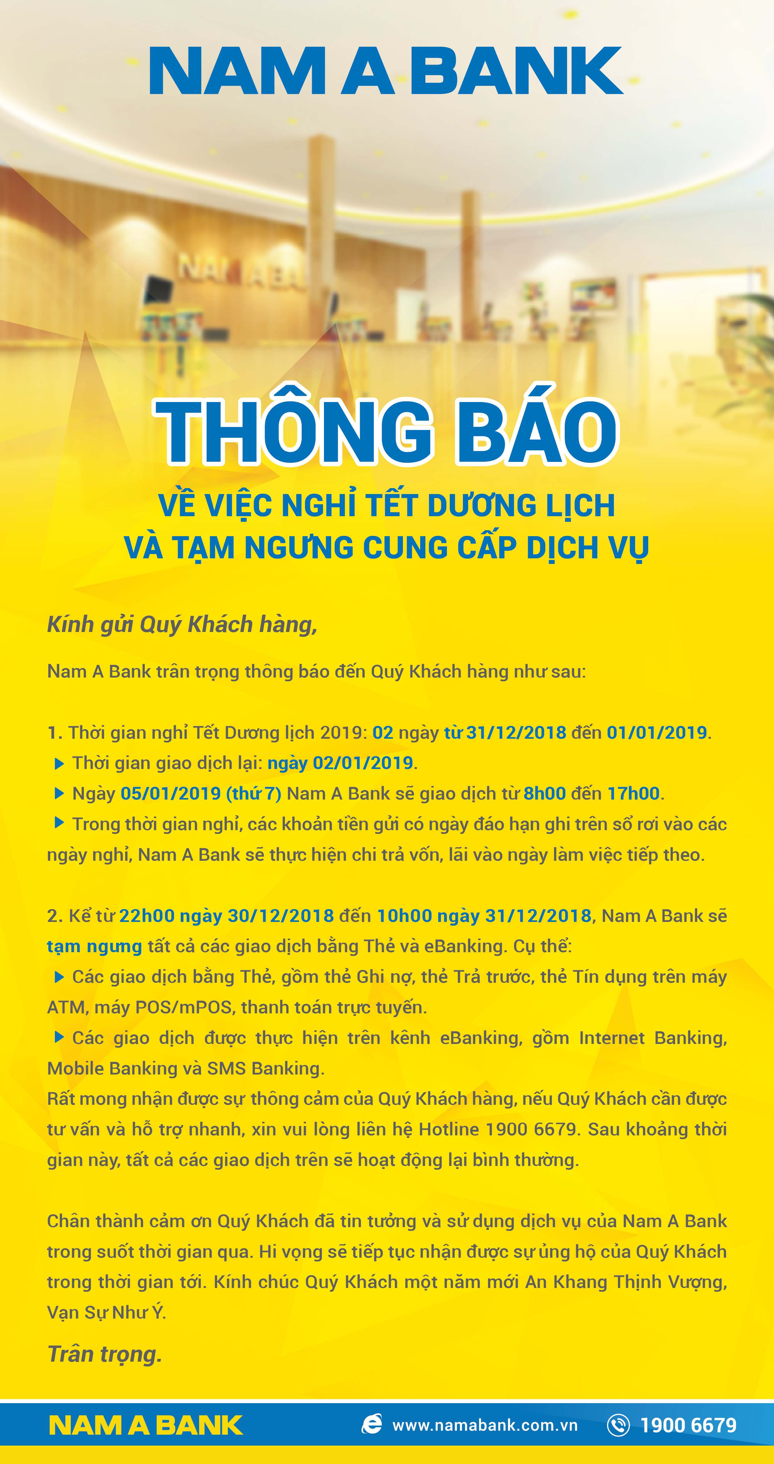 Nam A Bank thông báo v/v nghỉ Tết Dương lịch và tạm ngưng cung cấp dịch vụ