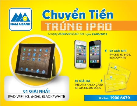 Từ ngày 25/4 đến 25/6/2012, NAM A BANK triển khai Chương trình “Chuyển tiền – Trúng IPAD” nhằm ưu đãi cho các khách hàng sử dụng dịch vụ tài chính cá nhân.