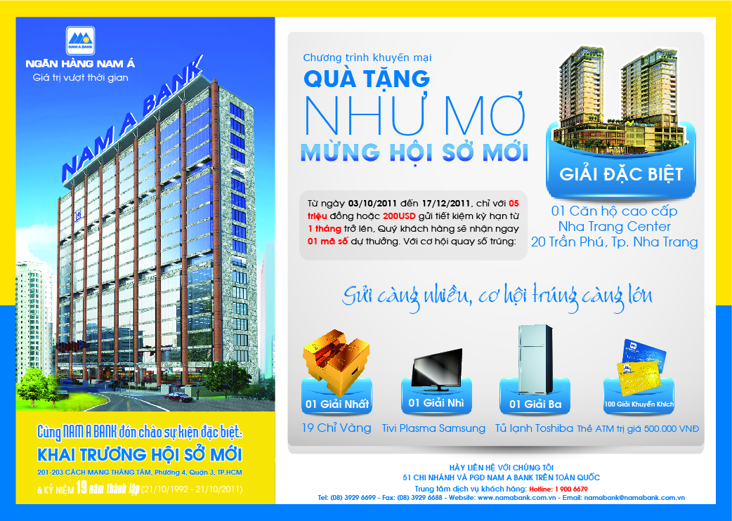 Chi tiết về Chương trình khuyến mại, Quý khách vui lòng xem tại đây hoặc liên hệ: - Các điểm giao dịch của Nam A Bank trên toàn quốc. - Hoặc Trung tâm dịch vụ khách hàng 1900 6679