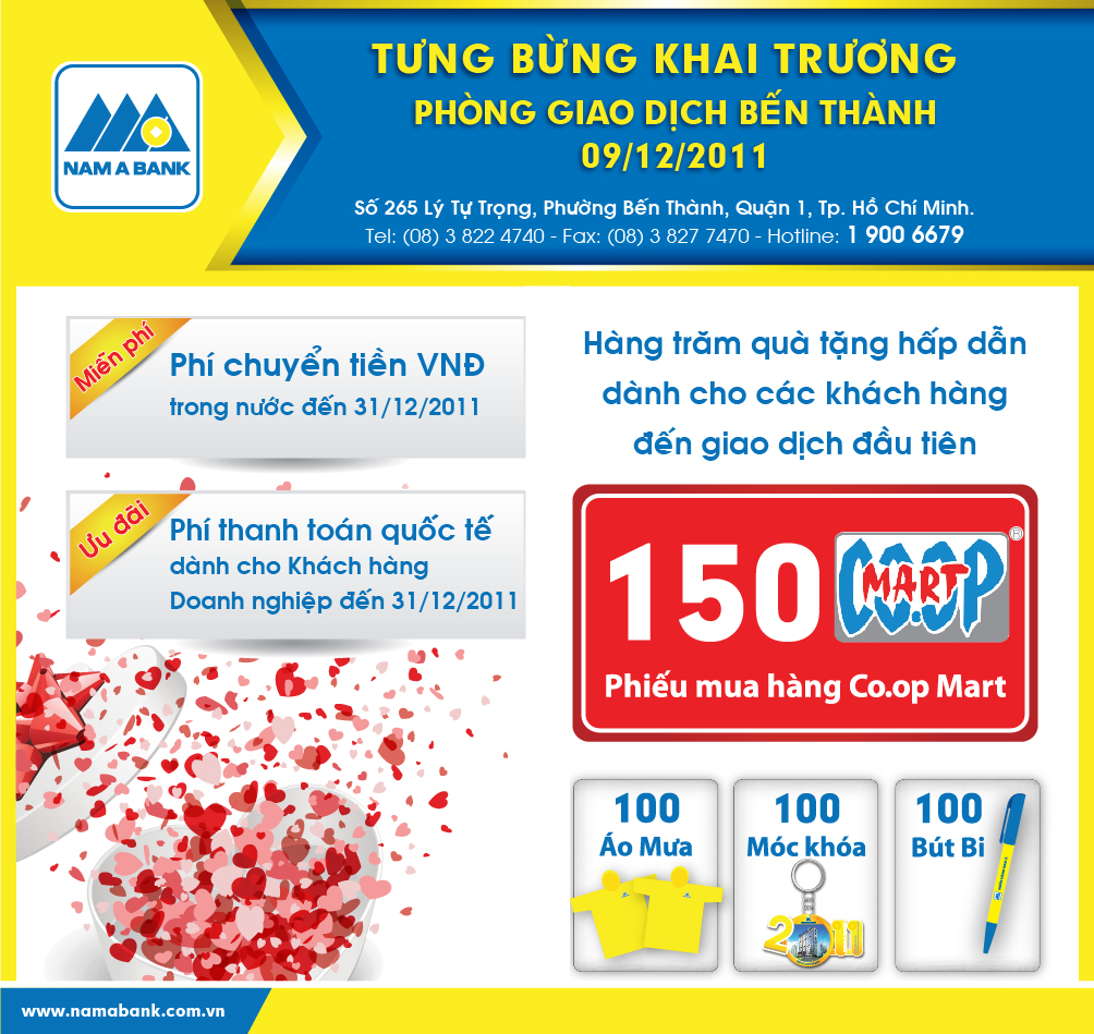Sáng ngày 9/12/2011, Ngân hàng TMCP Nam Á (NAM A BANK) tưng bừng tổ chức Lễ khai trương Phòng giao dịch Bến Thành - Số 265, Lý Tự Trọng, Phường Bến Thành, Quận 1, Tp. Hồ Chí Minh