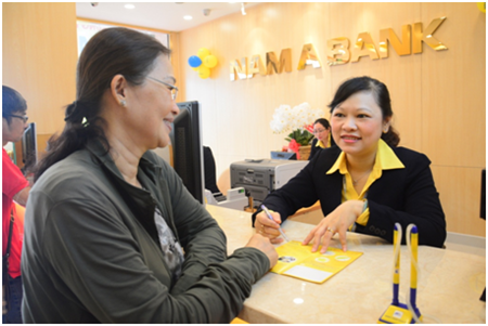 Khách hàng đang giao dịch tiền gửi tại trụ sở mới Nam A Bank Bình Tây