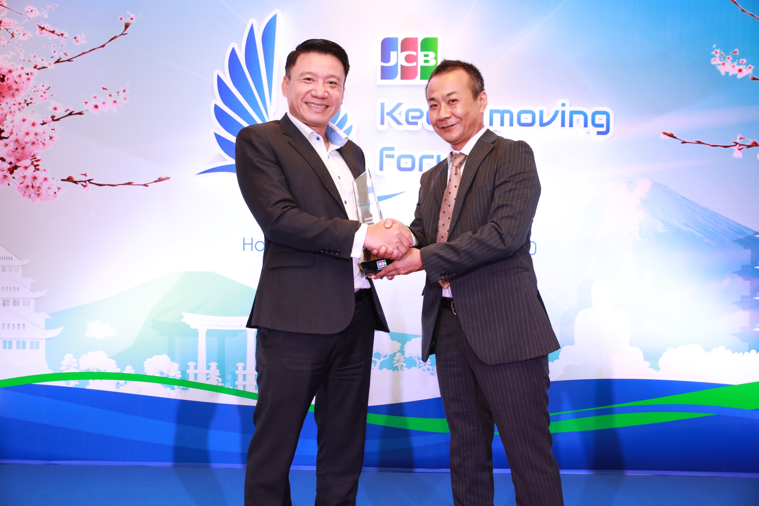 Ông Kazuma Shukuin – Trưởng đại diện Tổ chức thẻ quốc tế JCB tại Việt Nam trao tặng giải thưởng cho đại diện Nam A Bank – Ông Hoàng Việt Cường, Phó Tổng Giám đốc Nam A Bank.