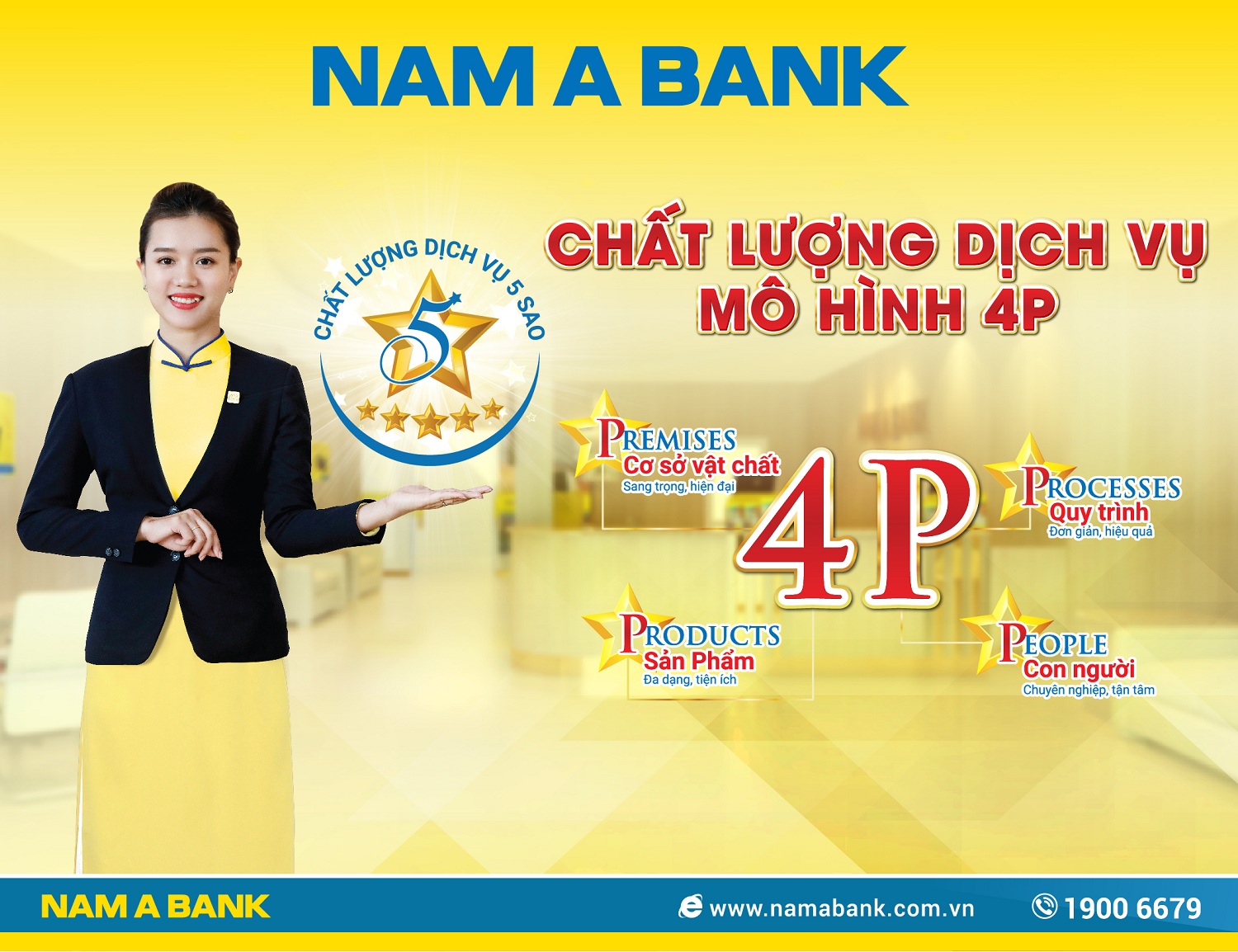 Trong bối cảnh hiện nay, Nam A Bank xác định luôn không ngừng nâng cao chất lượng dịch vụ, gia tăng mức độ hài lòng của khách hàng, từ đó xây dựng lợi thế cạnh tranh bền vững và tạo ra sự khác biệt. Trên chặng đường mang đến cho khách hàng những trải nghiệm hoàn hảo nhất, Nam A Bank đã xây dựng và triển khai mạnh mẽ mô hình Chất lượng dịch vụ 4P nhằm xác định 04 chuẩn mực then chốt hình thành Chất lượng dịch vụ 5 Sao đó là Premises: Cơ sở vật chất, People: Con người, Processes: Quy trình và Products: Sản phẩm dịch vụ.