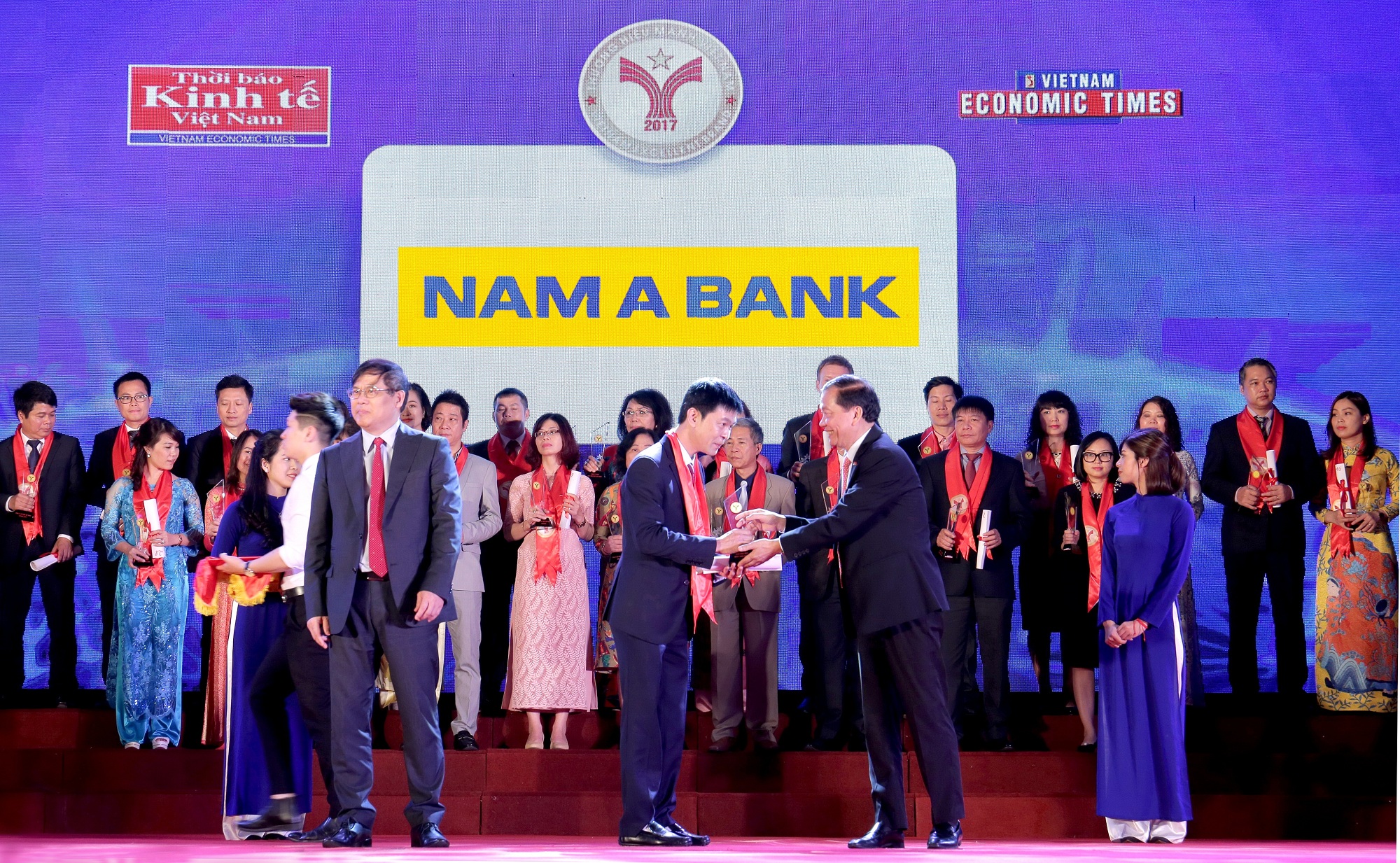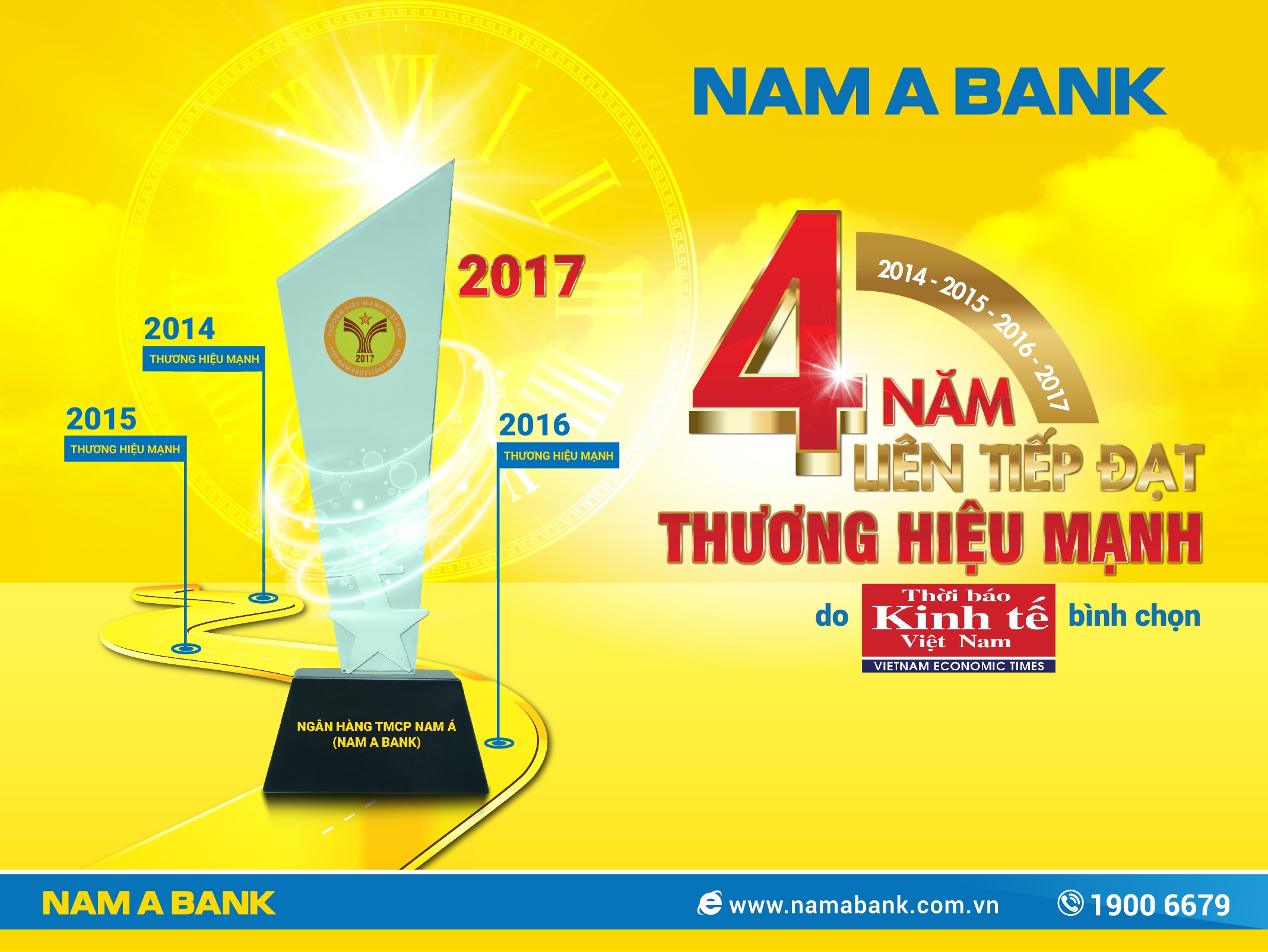 Với những nỗ lực và kết quả kinh doanh khả quan, chất lượng sản phẩm dịch vụ, độ phủ sóng thương hiệu, nguồn nhân lực và trách nhiệm xã hội, Nam A Bank đã được vinh danh “Thương hiệu mạnh Việt Nam 2017”. Đây cũng là năm thứ 4 liên tiếp Ngân hàng được Thời báo Kinh tế Việt Nam trao tặng giải thưởng uy tín này.