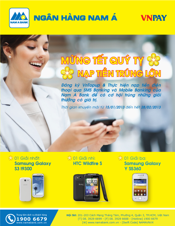 Nhân dịp Xuân mới 2013, Ngân hàng Nam Á (NAM A BANK) phối hợp với Công ty CP giải pháp thanh toán Việt Nam (VNPAY) triển khai chương trình khuyến mại "Mừng Tết Quý Tỵ - Nạp tiền trúng lớn", kéo dài từ 15/01 đến ngày 28/02/2013.