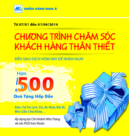 Nhân dịp đón năm mới 2014, Ngân hàng Nam Á – Chi nhánh Nha Trang triển khai chương trình “Chăm sóc khách hàng thân thiết nhân dịp cuối năm 2013” nhằm tri ân khách hàng thân thiết đã và đang đồng hành cùng Ngân hàng Nam Á – Chi nhánh Nha Trang trong suốt thời gian qua. Chương trình triển khai từ 07/01 – 01/04/2014 với hàng trăm phần quà hấp dẫn.