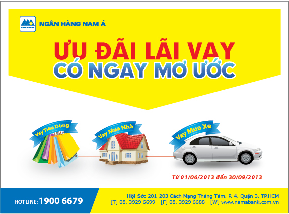 Từ 01/06/2013 đến 30/09/2013, Ngân hàng TMCP Nam Á (NAM A BANK) chính thức triển khai Chương trình “Ưu đãi lãi vay – Có ngay mơ ước”. Theo đó, Ngân hàng Nam Á ưu đãi lãi suất cực kỳ hấp dẫn dành cho các khách hàng cá nhân có nhu cầu vay tiêu dùng, vay mua xe ô tô, vay mua nhà an cư.
