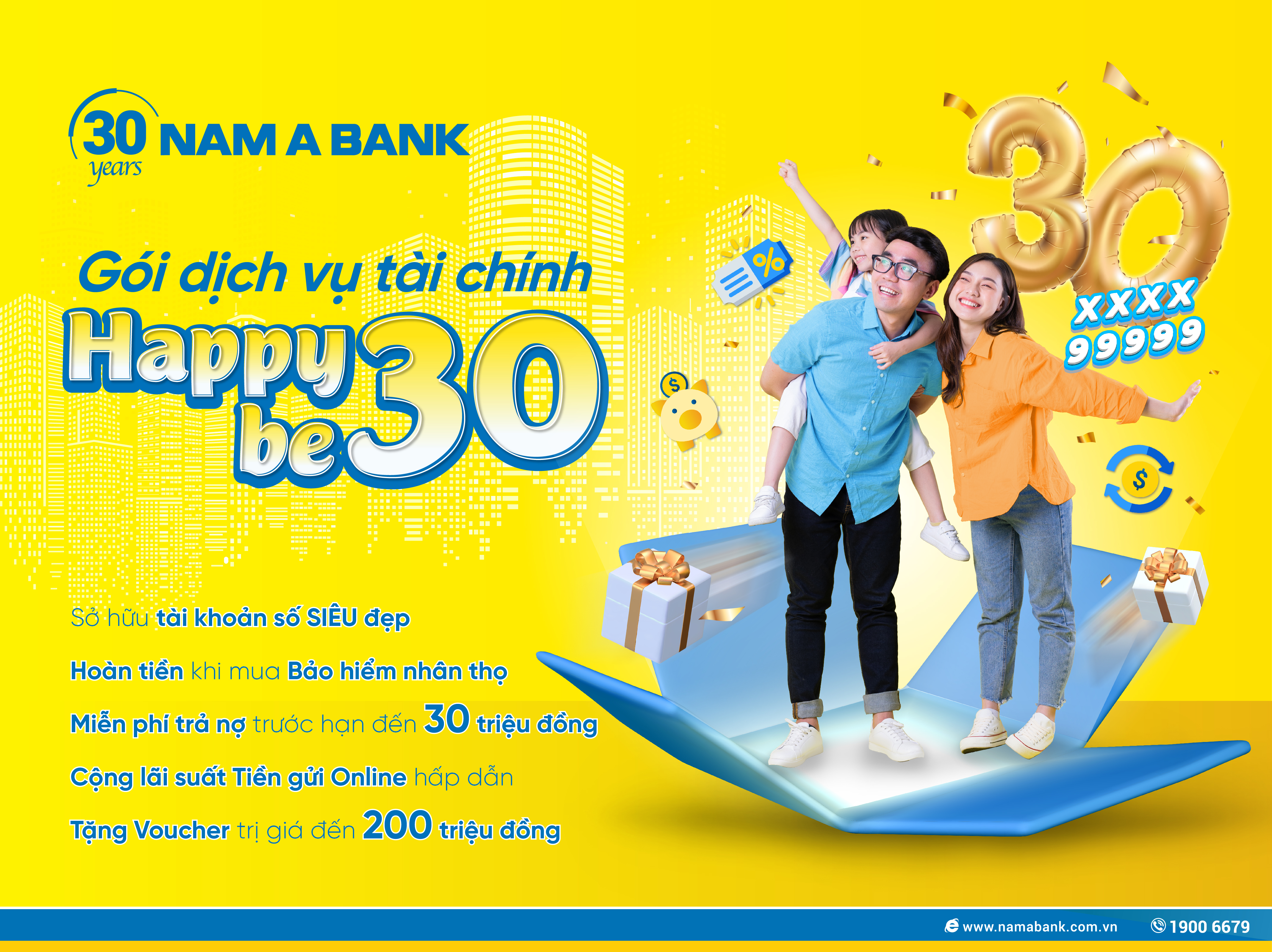 Đại diện Nam A Bank cho biết: “Nam A Bank thường xuyên triển khai các sản phẩm mới giúp giao dịch nhanh chóng, an toàn và tiết kiệm... Gói Happy Be30 nhằm tối ưu hóa trải nghiệm, đồng hành cùng KH trong hành trình hoàn thành mọi dự định cá nhân. Đây cũng là món quà tri ân KH nhân kỷ niệm 30 năm thành lâp Ngân hàng”.