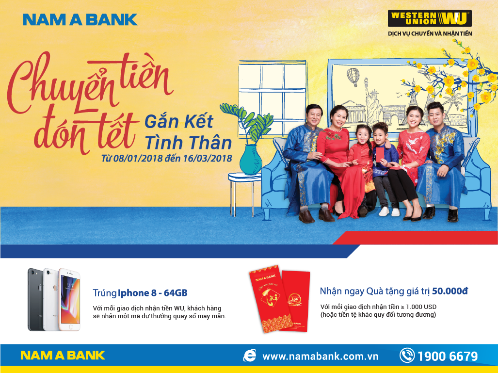 Mừng Xuân Mậu Tuất, từ nay đến 16/03/2018, Nam A Bank phối hợp cùng BIDV triển khai chương trình “Chuyển tiền đón Tết – Gắn kết tình thân”. Theo đó, khi khách hàng nhận kiều hối Western Union (WU) tại Nam A Bank sẽ có cơ hội trúng 8 Iphone 8 64GB sành điệu cùng nhiều giải thưởng giá trị.
