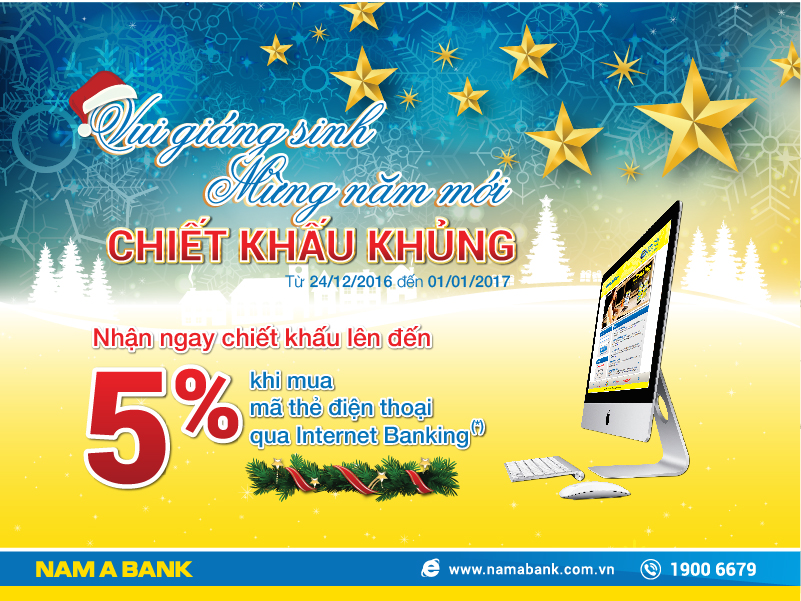 Với chương trình ưu đãi này, khách hàng thoải mái gửi tin nhắn, gọi điện chúc mừng giáng sinh, năm mới mà không lo mất kết nối. Hơn nữa, không cần dùng tiền mặt, không phải đến đại lý mua thẻ cào, khách hàng có thể mua mã thẻ điện thoại, chủ động nạp tiền mọi lúc mọi nơi cho mình, người thân và bạn bè chỉ với vài thao tác đơn giản trên Internet Banking của Nam A Bank.