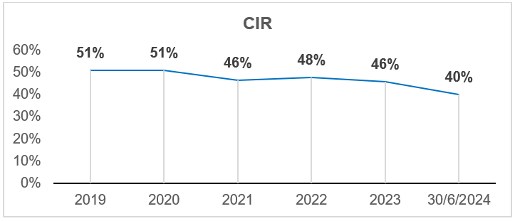 Tỷ lệ chi phí/tổng thu nhập hoạt động (CIR) tại NAB trong quý 2/2024 đã có sự cải thiện hiệu quả, CIR quý 2 về sát mốc 40% - mức thấp nhất trong 5 năm gần đây.