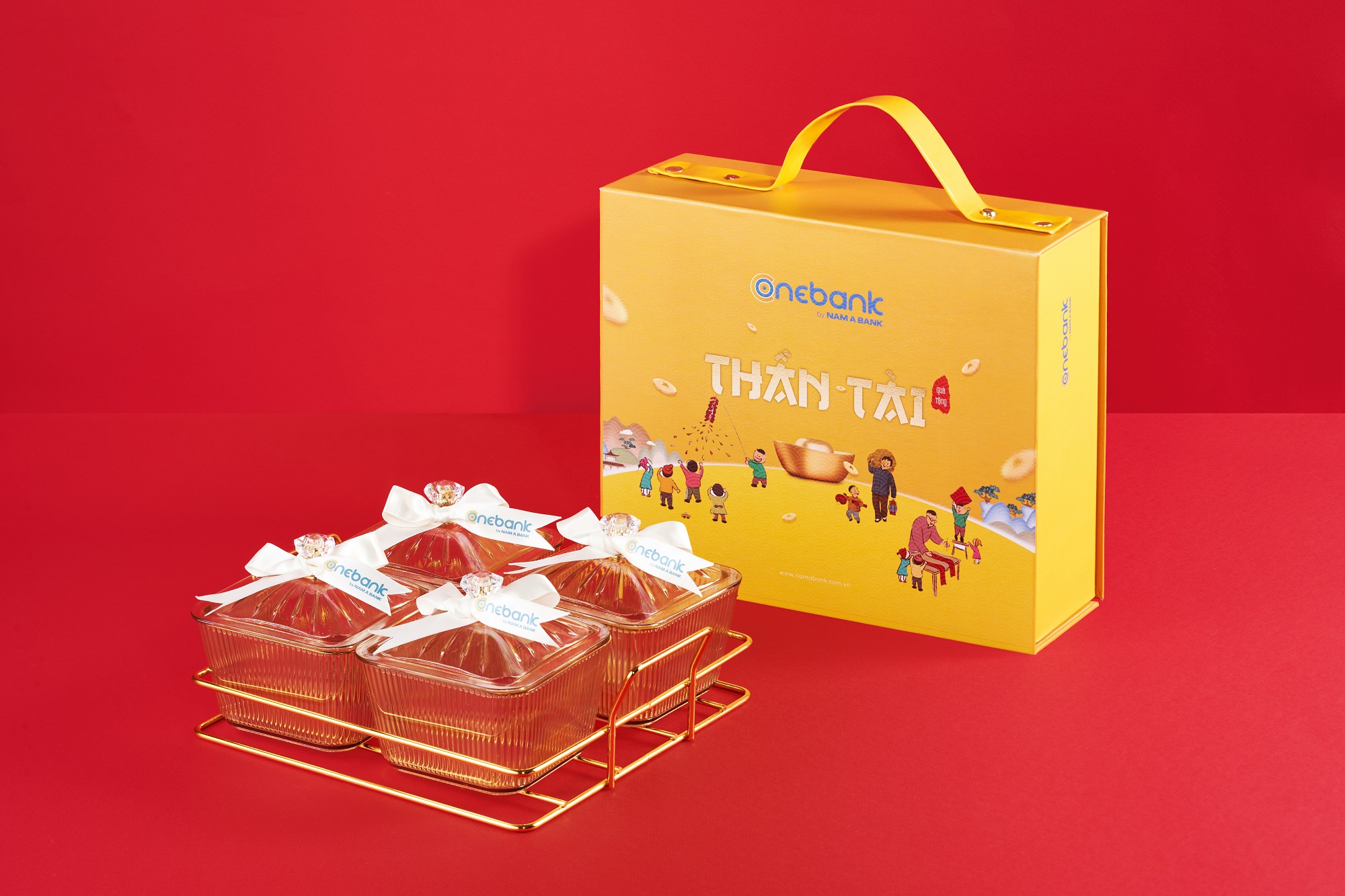 Mang hơi hướng trẻ trung, hiện đại với thiết kế sang trọng, Bộ quà Thần Tài gồm 4 hũ mứt kèm khay vàng đồng cùng ruy băng nơ lụa tinh tế tượng trưng cho sự đoàn viên bên nhau của các gia đình trong dịp Tết. Đồng thời, với bộ quà Tết này, Nam A Bank gửi lời chúc đến khách hàng một năm mới tài lộc và thịnh vượng.