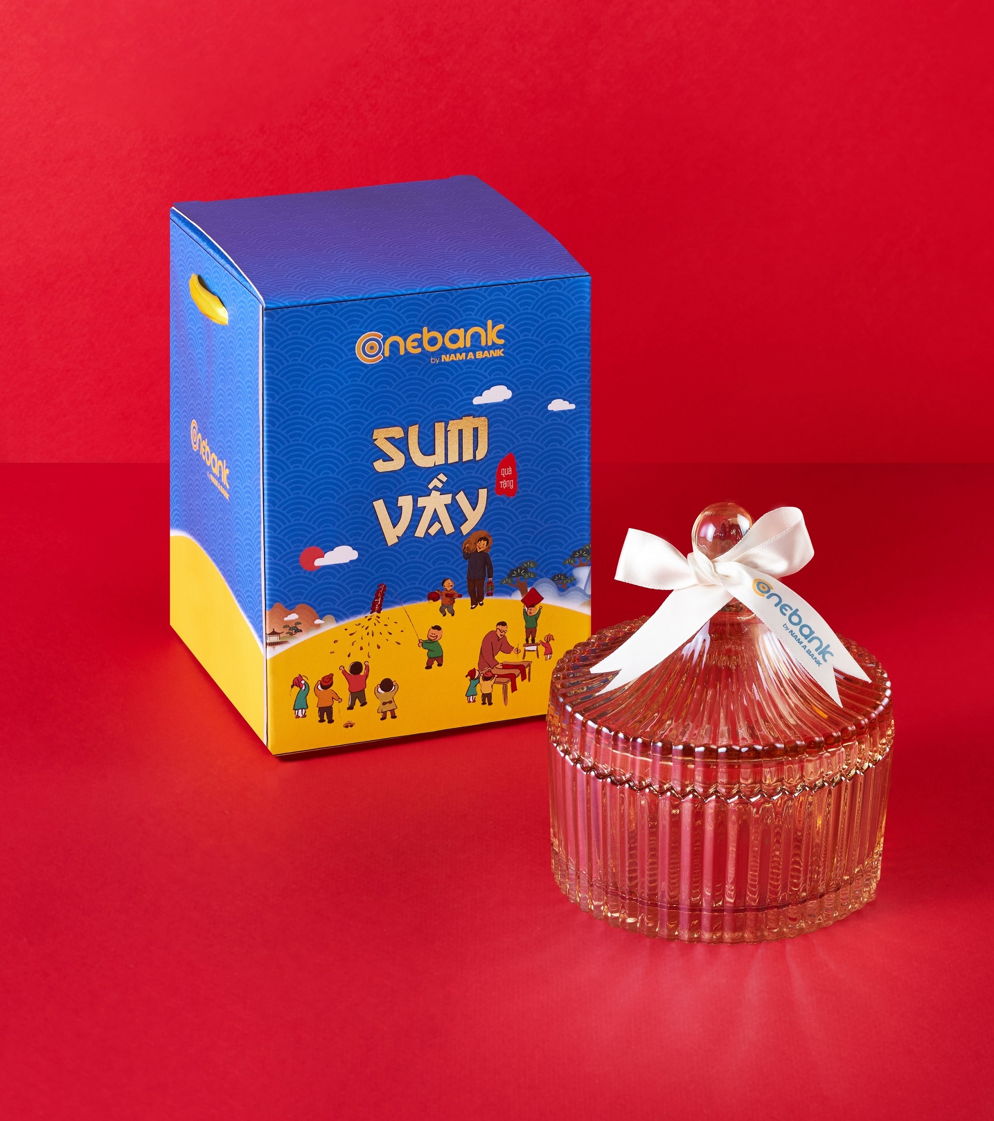 Nam A Bank cũng gửi tặng đến khách hàng bộ quà Sum vầy được sản xuất với chất liệu thủy tinh cao cấp, trong suốt mang màu vàng thương hiệu Nam A Bank, phù hợp với các khách hàng là giới trẻ. Tết là sum vầy, Tết là về nhà.