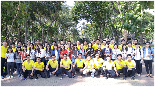Các chàng trai của Nam A Bank chụp hình kỷ niệm cùng các bạn nữ đã được nhận hoa từ Nam A Bank