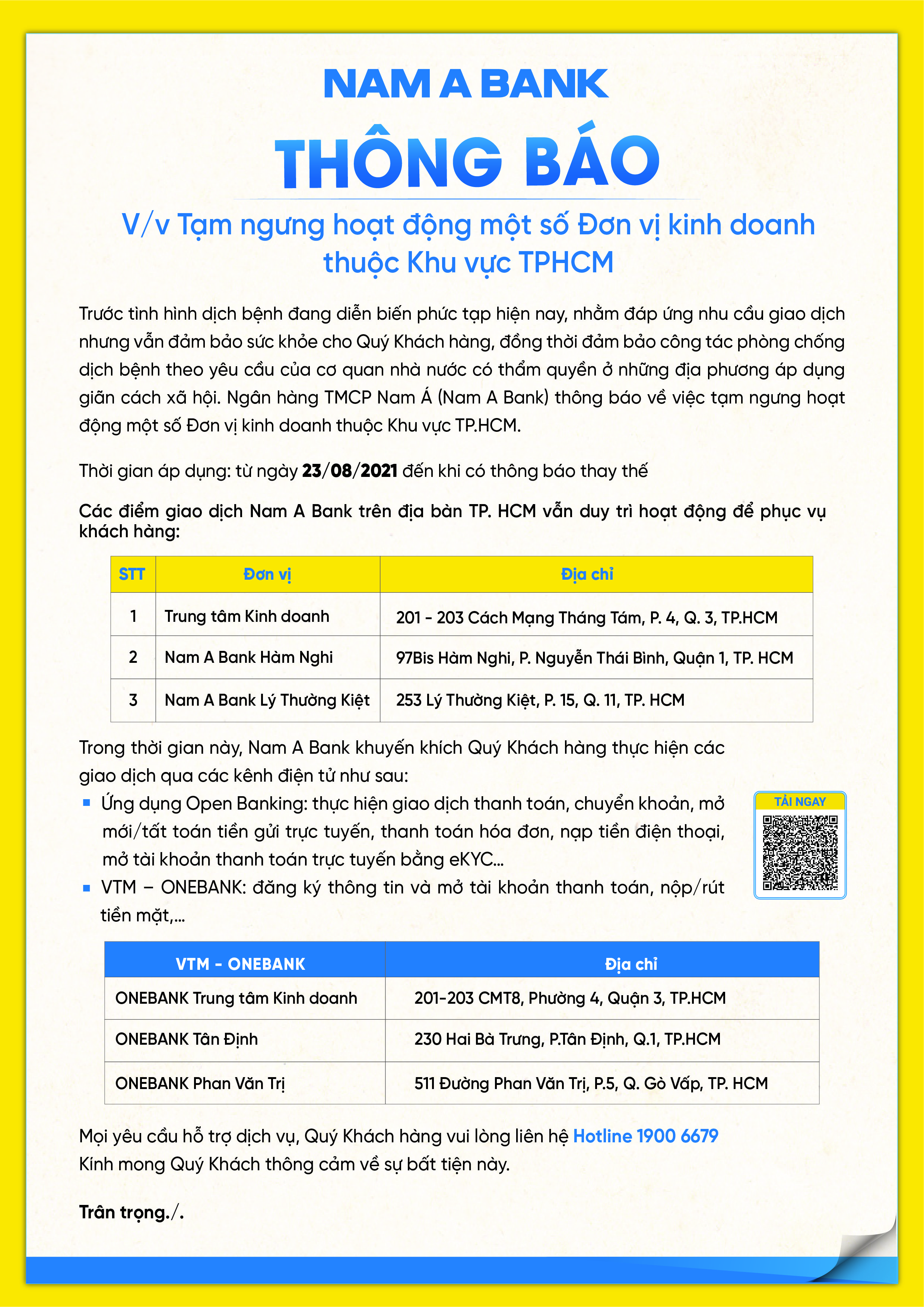 THÔNG BÁO TẠM NGƯNG HOẠT ĐỘNG MỘT SỐ ĐƠN VỊ KINH DOANH THUỘC KHU VỰC TP.HCM