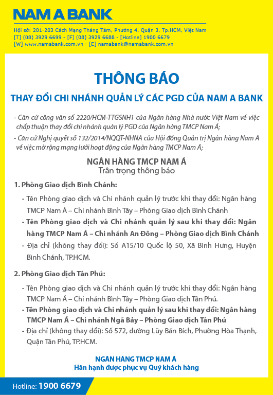 Thông báo: Thay đổi Chi Nhánh quản lý các PGD của NAM A BANK