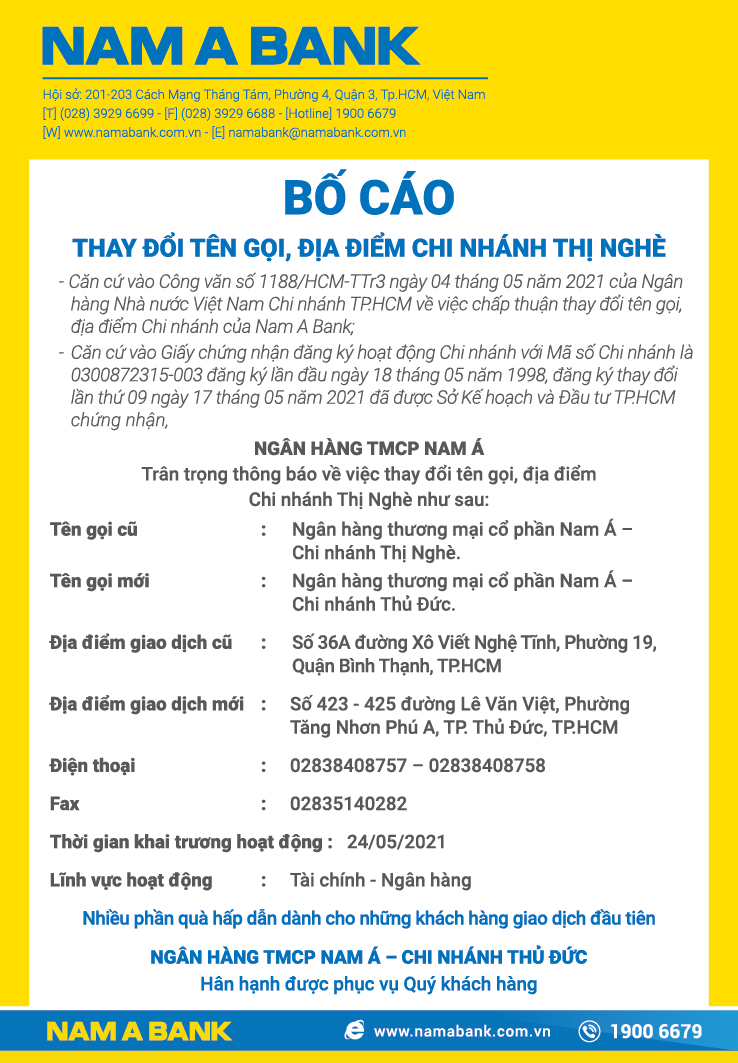 THÔNG BÁO THAY ĐỔI TÊN GỌI, ĐỊA ĐIỂM CHI NHÁNH THỊ NGHÈ