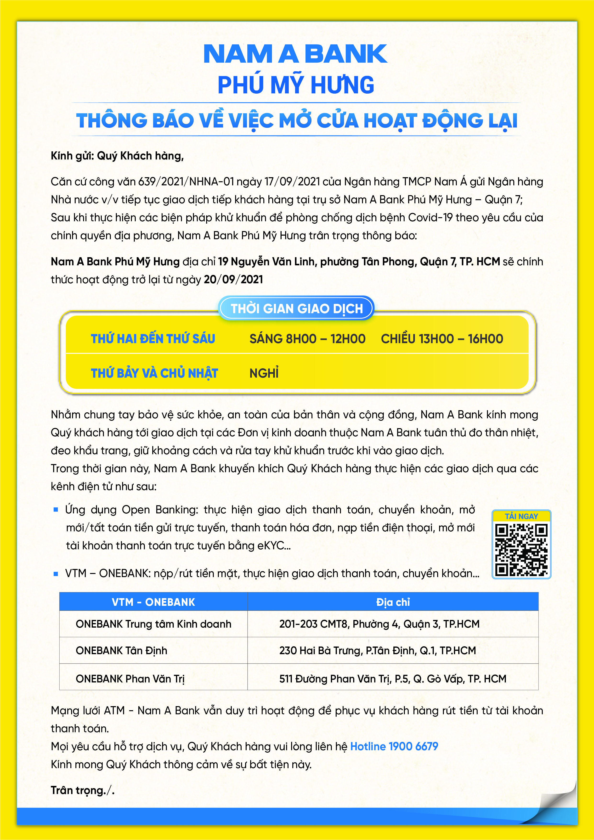 THÔNG BÁO V/v NAM A BANK PHÚ MỸ HƯNG MỞ CỬA HOẠT ĐỘNG LẠI