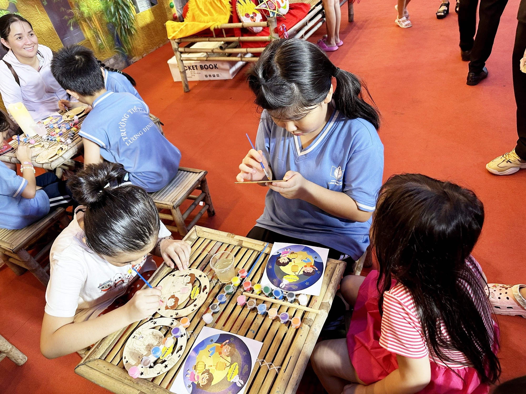 Các em nhỏ là con em của khách hàng và CBNV chăm chú “Tô trăng vàng, vẽ hạnh phúc” tại Phố lồng đèn Nam A Bank