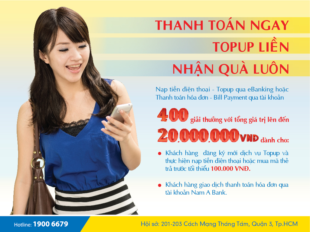 Nhằm tri ân khách hàng cũ và thu hút thêm khách hàng mới, Nam A Bank kết hợp với VNPAY triển khai chương trình khuyến mại ‘ Thanh toán ngay – Topup liền – Nhận quà luôn’.