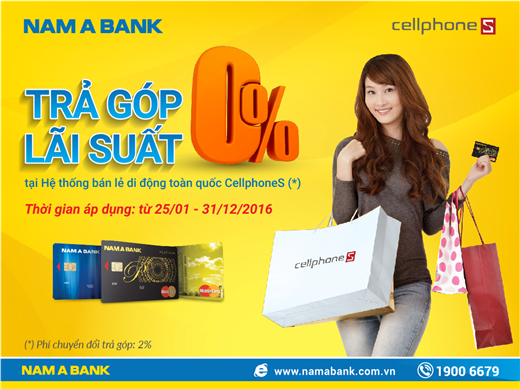Với mong muốn mang lại cho khách hàng nhiều sự lựa chọn hơn trong việc mua sắm các thiết bị điện thoại di động, từ 25/01/2016 đến 31/12/2016, chủ Thẻ tín dụng Quốc tế Nam A Bank sẽ có cơ hội sở hữu ngay những chiếc điện thoại di động yêu thích với chương trình trả góp lãi suất 0% lên đến 12 tháng cực kỳ hấp dẫn tại Hệ thống của hàng bán lẻ di động CellphoneS trên toàn quốc. Với kỳ hạn trả góp linh động 3 tháng, 6 tháng, 9 tháng và 12 tháng cùng nhiều mức tỷ lệ trả góp, Quý khách sẽ dễ dàng thanh toán và thuận tiện hơn trong việc mua sắm.
