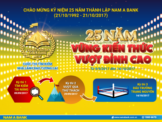 Tại Nam A Bank, việc thu hút và giữ chân nhân tài chính là ưu tiên hàng đầu trong chiến lược nhân sự của Ngân hàng. Đó chính là lý do cho sự ra đời của cuộc thi tìm kiếm nhà lãnh đạo tương lai Trạng Nguyên Nam A Bank. Sau hai mùa tổ chức thành công 2015-2016, năm nay, hướng đến sự kiện quan trọng chào mừng kỷ niệm 25 năm thành lập Ngân hàng, cuộc thi Trạng Nguyên Nam A Bank 2017 chính thức trở lại - hiện đại, lôi cuốn và không kém phần gay cấn.